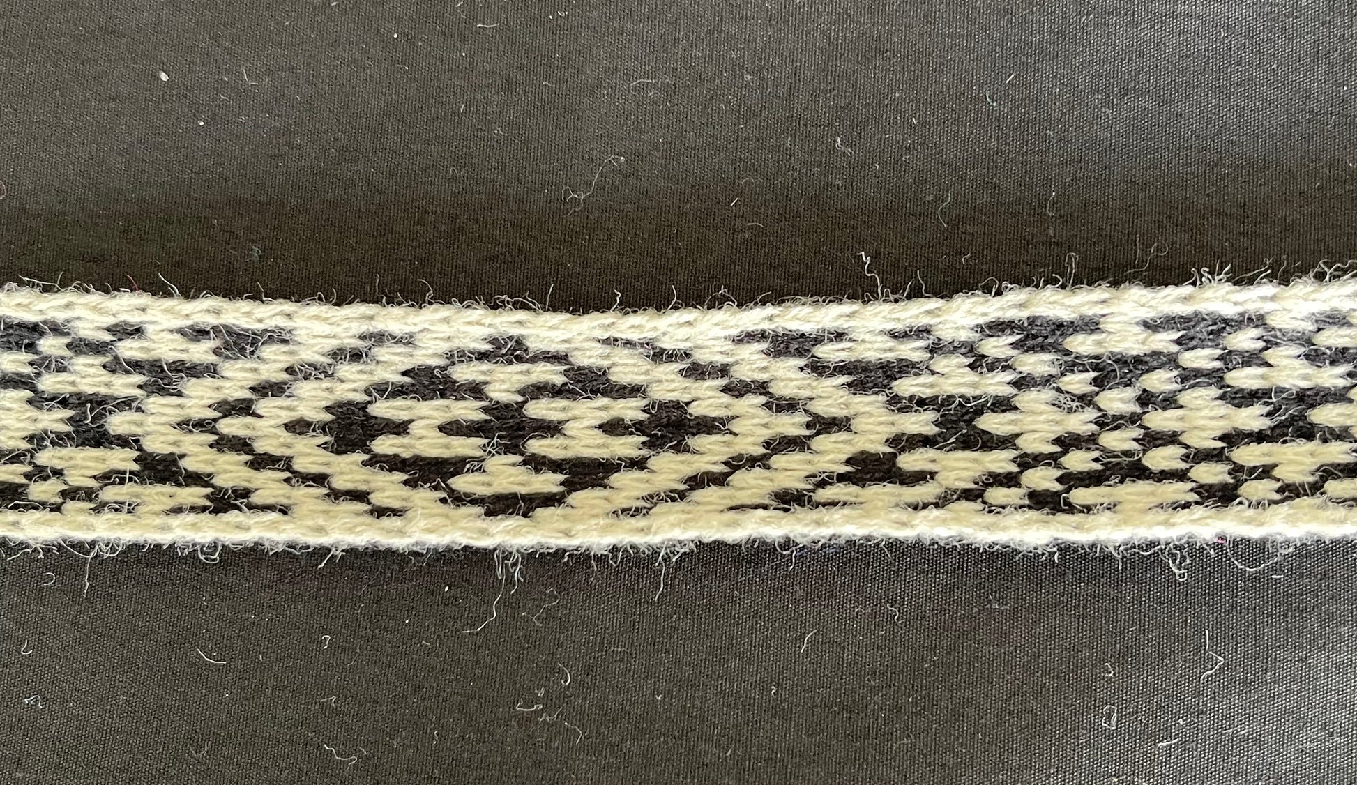 This beige and black Taniko Band is 1 inches wide. This is available for 1 metre or a 5 metre roll. Patiki (flounder) designs are based on the diamond shape of the flounder fish. The flounder is a symbol of favourable times, prosperity and good luck.