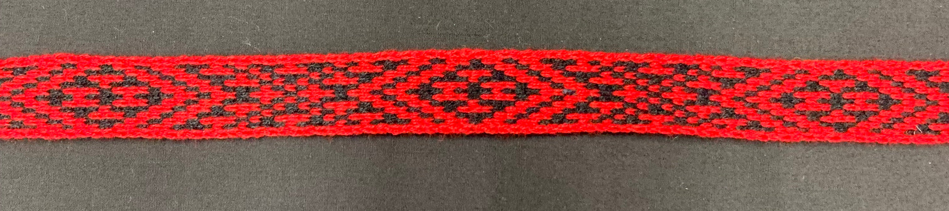 This red and black Taniko Band is 1 inches wide. This is available for 1 metre, 5 metre roll or 10 metre roll. Patiki (flounder) designs are based on the diamond shape of the flounder fish. The flounder is a symbol of favourable times, prosperity and good luck.