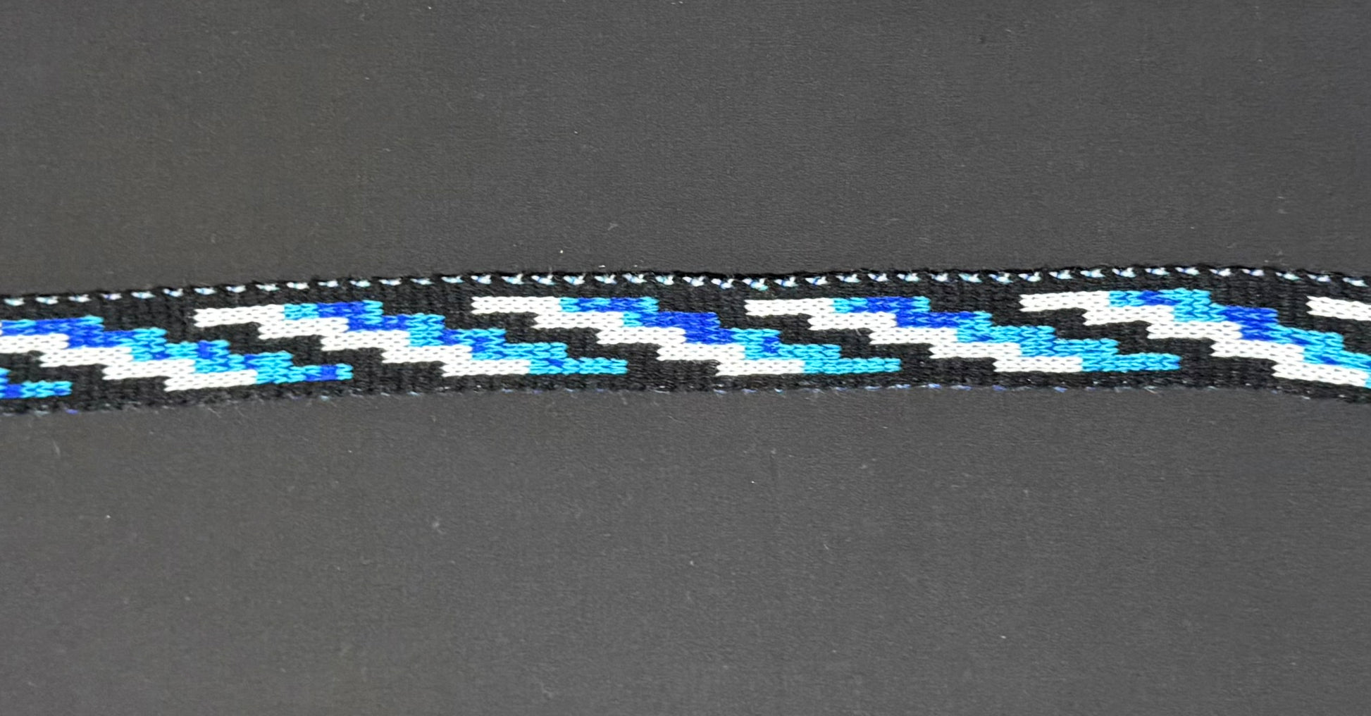 This Paua and white Poutama 1 inches wide Taniko band is available in 1 metre, 5 metre or 10 metre roll. If you would like to order more than 10 metres then contact us. Poutama design symbolises the growth of man, striving ever upwards. The poutama (step-like pattern) has both religious and educational meanings. The steps symbolise levels of attainment and advancement.