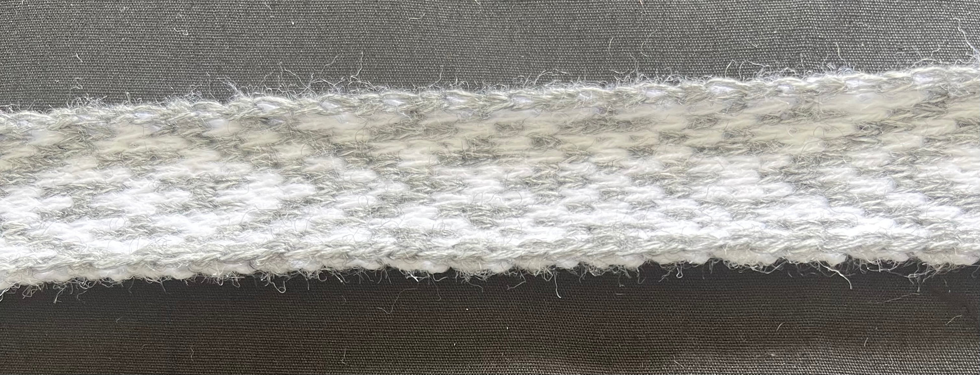 This grey and white Taniko Band is 1 inches wide. This is available for 1 metre or a 5 metre roll. Patiki (flounder) designs are based on the diamond shape of the flounder fish. The flounder is a symbol of favourable times, prosperity and good luck.