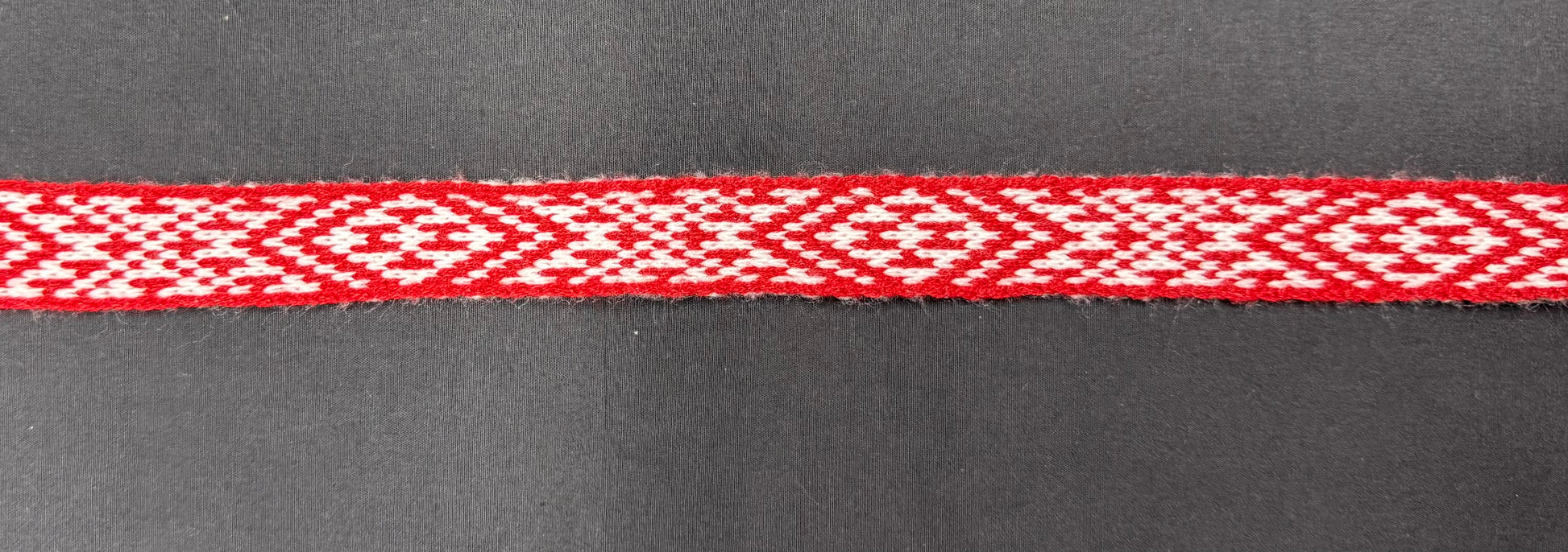 This red and white Taniko Band is 1 inches wide. This is available for 1 metre or a 5 metre roll. Patiki (flounder) designs are based on the diamond shape of the flounder fish. The flounder is a symbol of favourable times, prosperity and good luck.