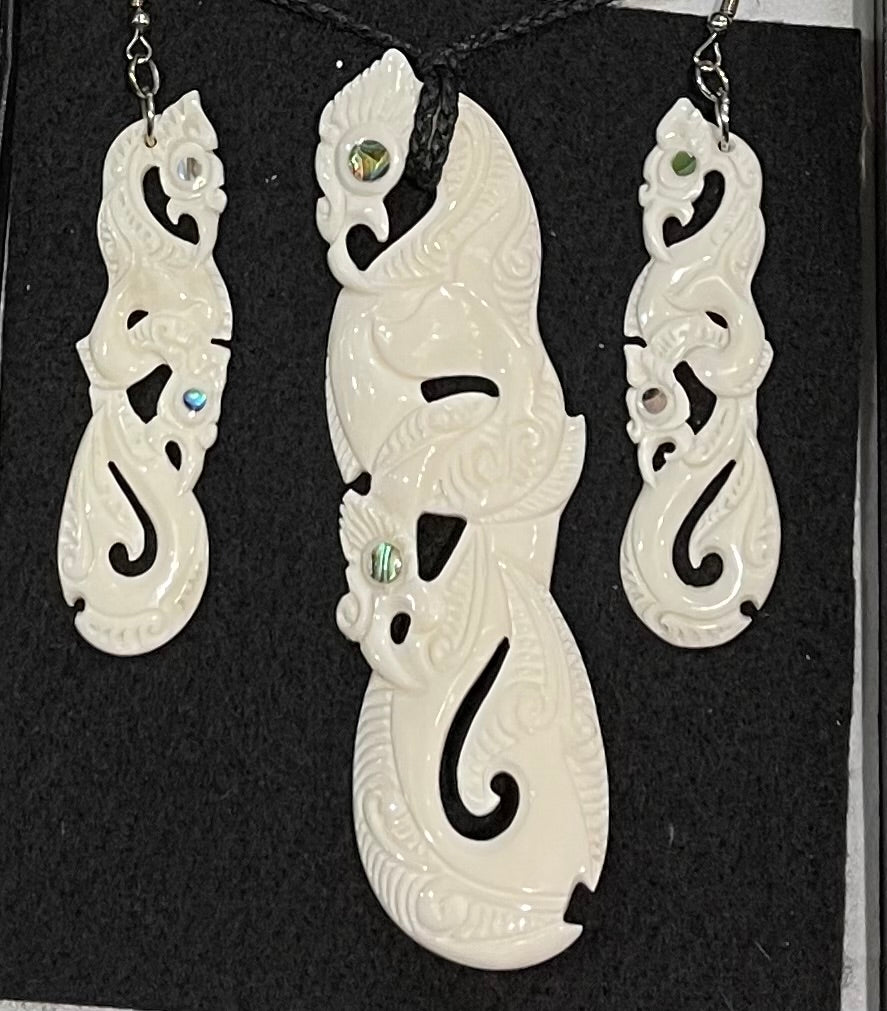 This Bone Manaia Set includes a necklace and earrings that are perfect for dressing up your look. Crafted with beef bone, this robust set provides a tactile feel for a unique look. The stylish earrings and necklace will bring a touch of elegance to any outfit.Pendant 8cm L