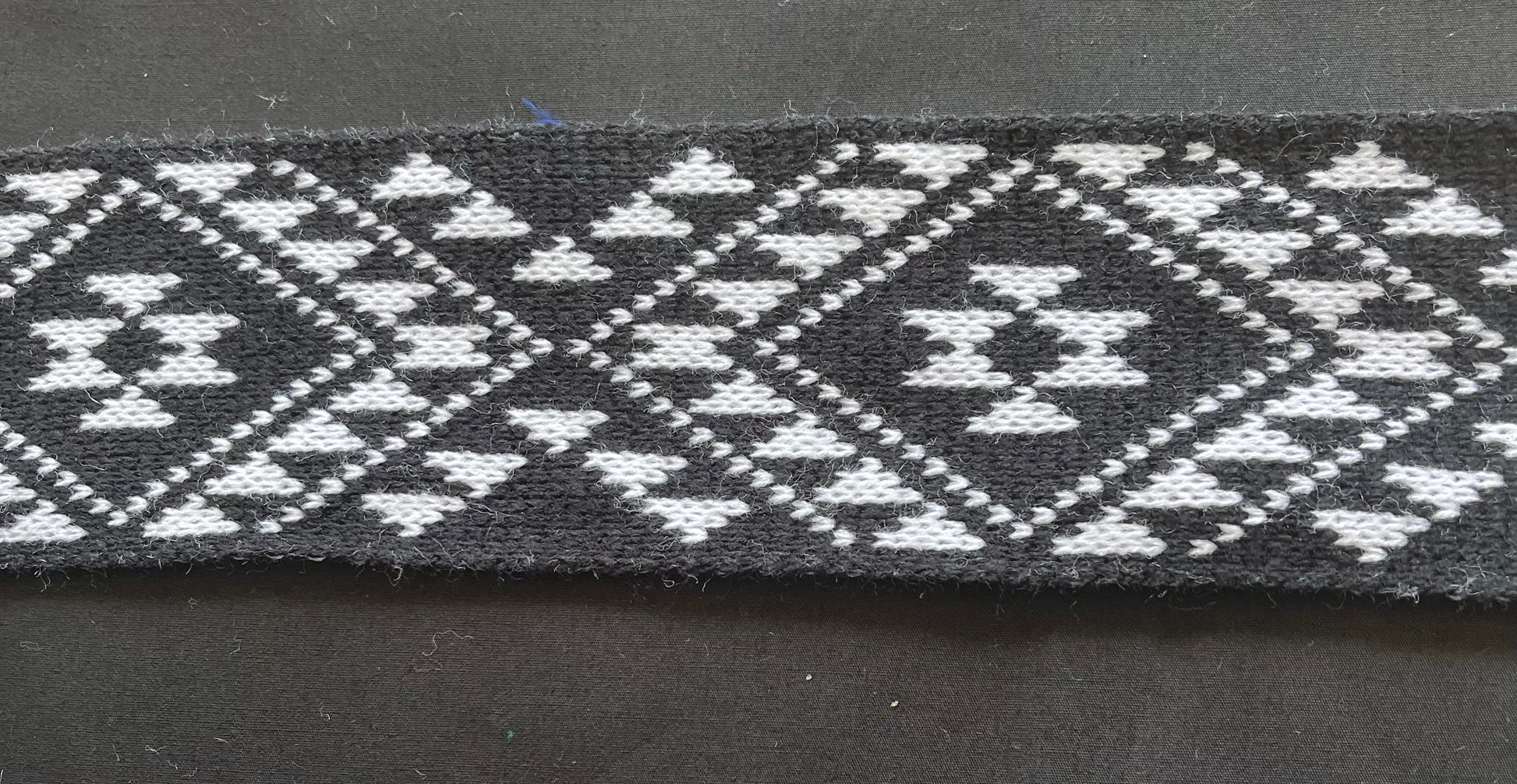 This black and white Pātiki Taniko Band is 2.5 inches wide. This is available for 1 metre or a 5 metre roll. Patiki (flounder) designs are based on the diamond shape of the flounder fish. The flounder is a symbol of favourable times, prosperity and good luck.