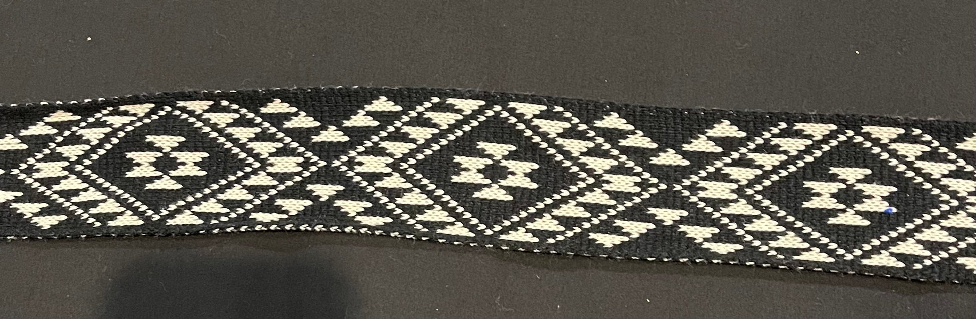 This black and beige Pātiki Taniko Band is 2.5 inches wide. This is available for 1 metre or a 5 metre roll. Patiki (flounder) designs are based on the diamond shape of the flounder fish. The flounder is a symbol of favourable times, prosperity and good luck.