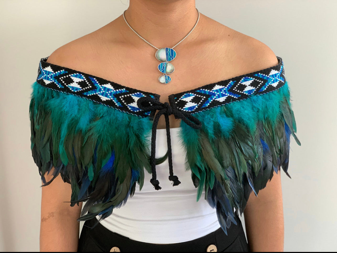 This stunning paua feathered Maori cape is an eye-catching addition to any wardrobe. A traditional Māori design, the feathers are placed in a pattern to create a unique cape. With breathtaking beauty, this cape is sure to be treasured. Korowai cape can be made in 2 days. This cape ties in the front. Size 102cm x 22cm