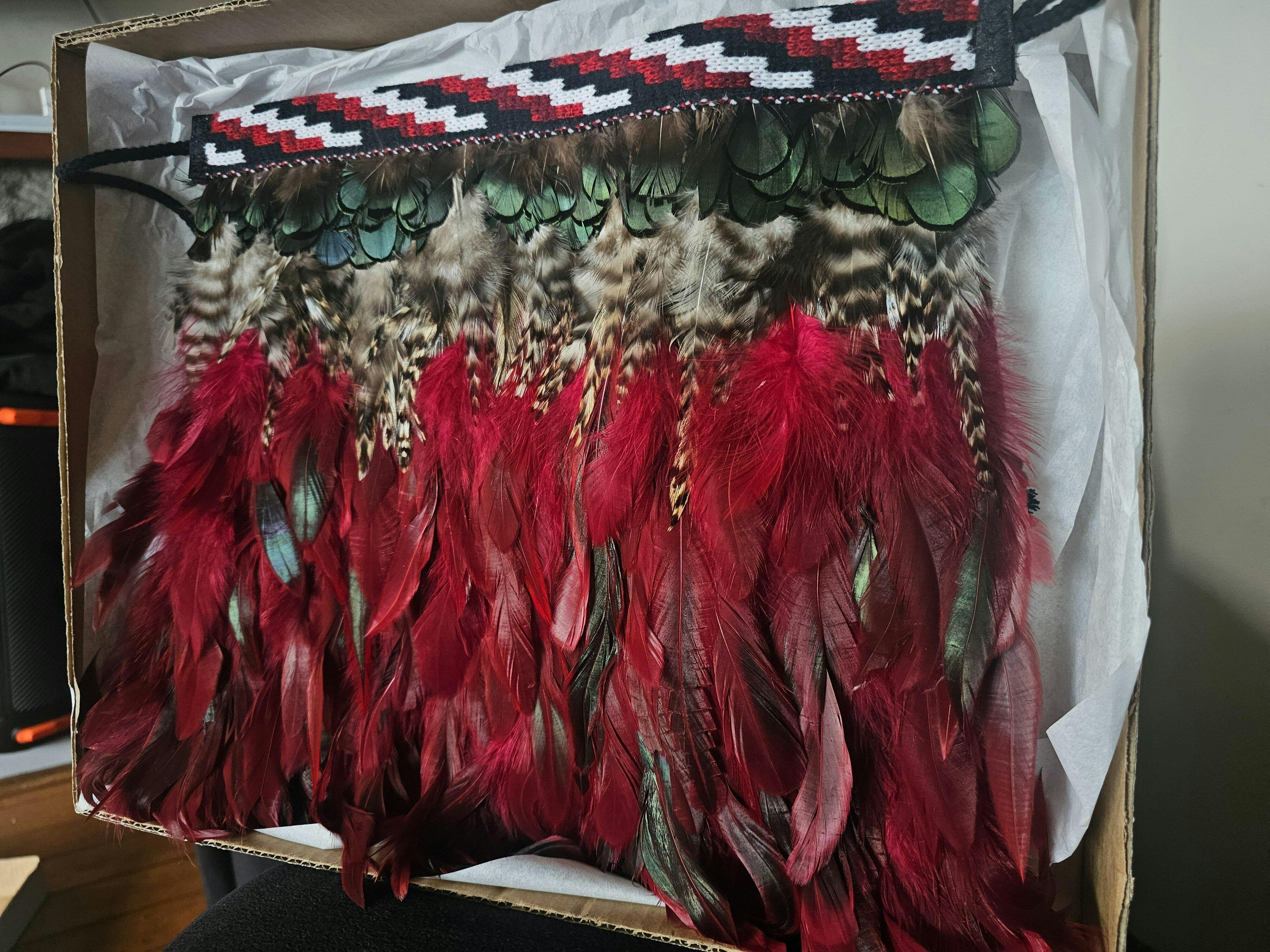 A baby Kakahu Korowai and band to match that can be used for a newborn or covering Māori Taonga pieces. Any colour or size korowai cloak can be made to order. Made with the best quality feathers.