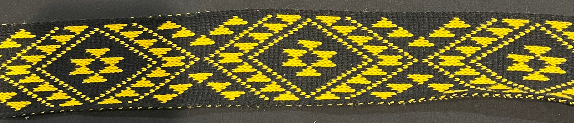 This Black and Gold Pātiki Taniko Band is 2.5 inches wide. This is available for 1 metre or a 5 metre roll. Patiki (flounder) designs are based on the diamond shape of the flounder fish. The flounder is a symbol of favourable times, prosperity and good luck.