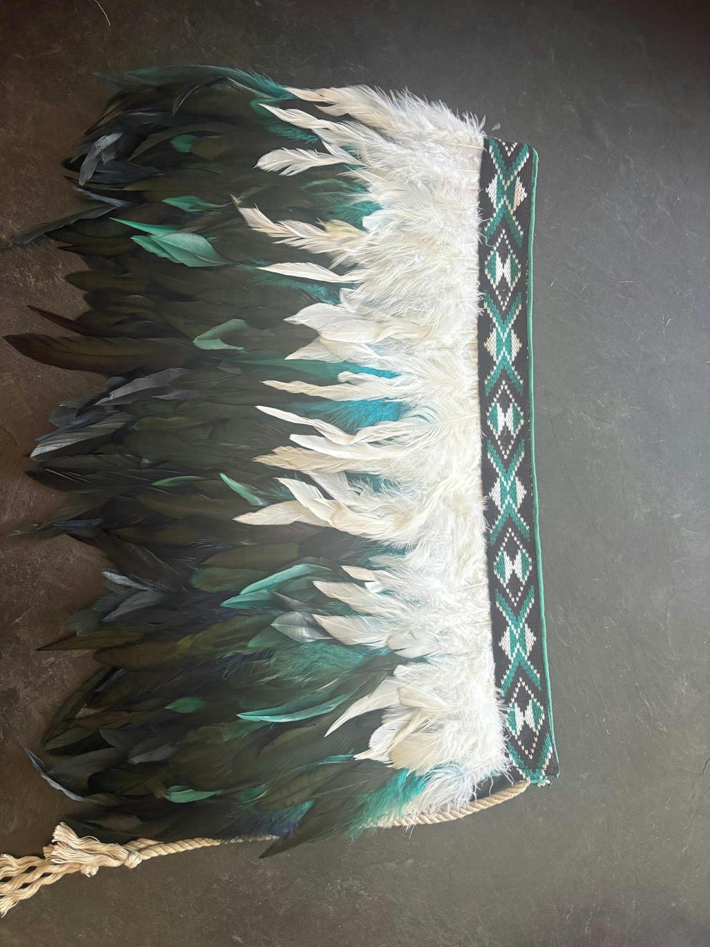 This Jade Green and white Pātiki Taniko Band is 2 inches wide. This is available for 1 metre or a 5 metre roll. Patiki (flounder) designs are based on the diamond shape of the flounder fish. The flounder is a symbol of favourable times, prosperity and good luck.