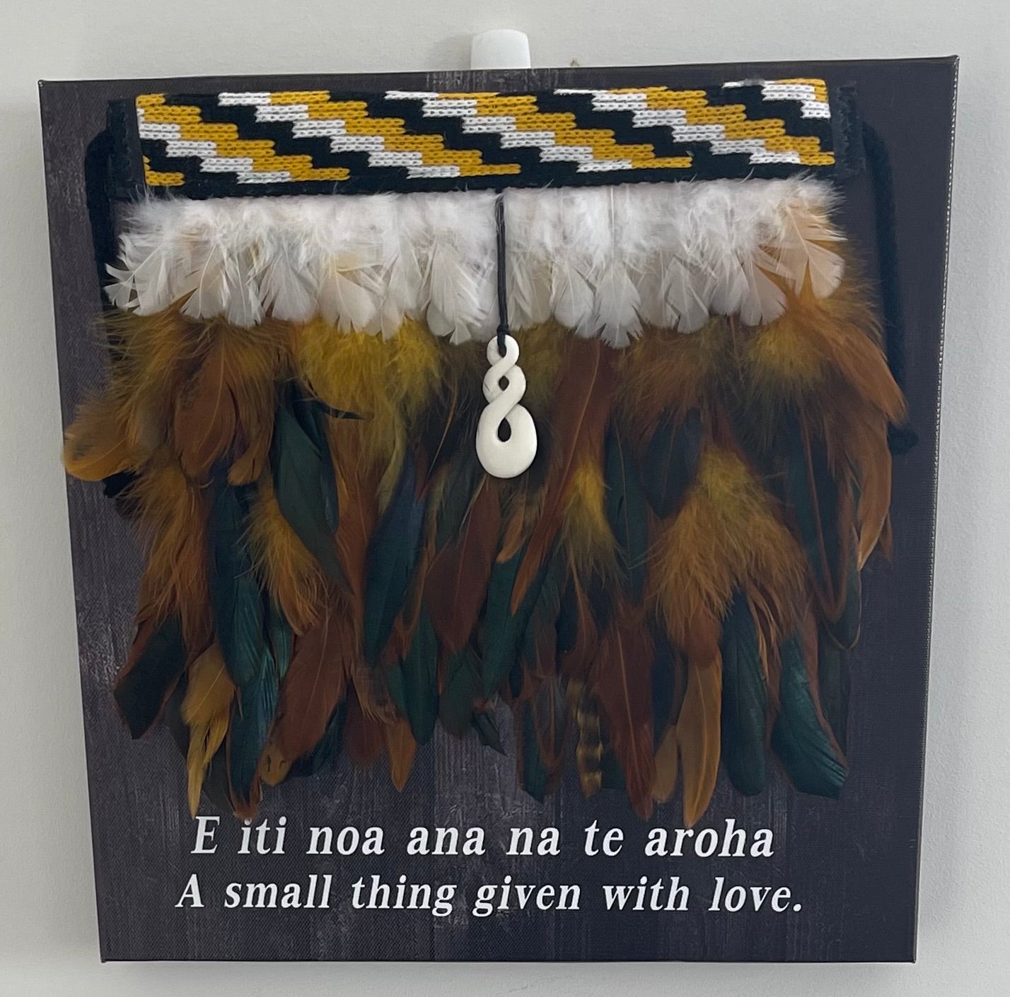 The Korowai On Canvas With a Saying - Whanau Aroha is an meaningful art piece that will add a touch of Maori culture to your home. It features a Korowai design with the saying ‘Whanau Aroha’ printed on a canvas. Perfect for any home looking for a unique Maori art piece. 30cmx30cm