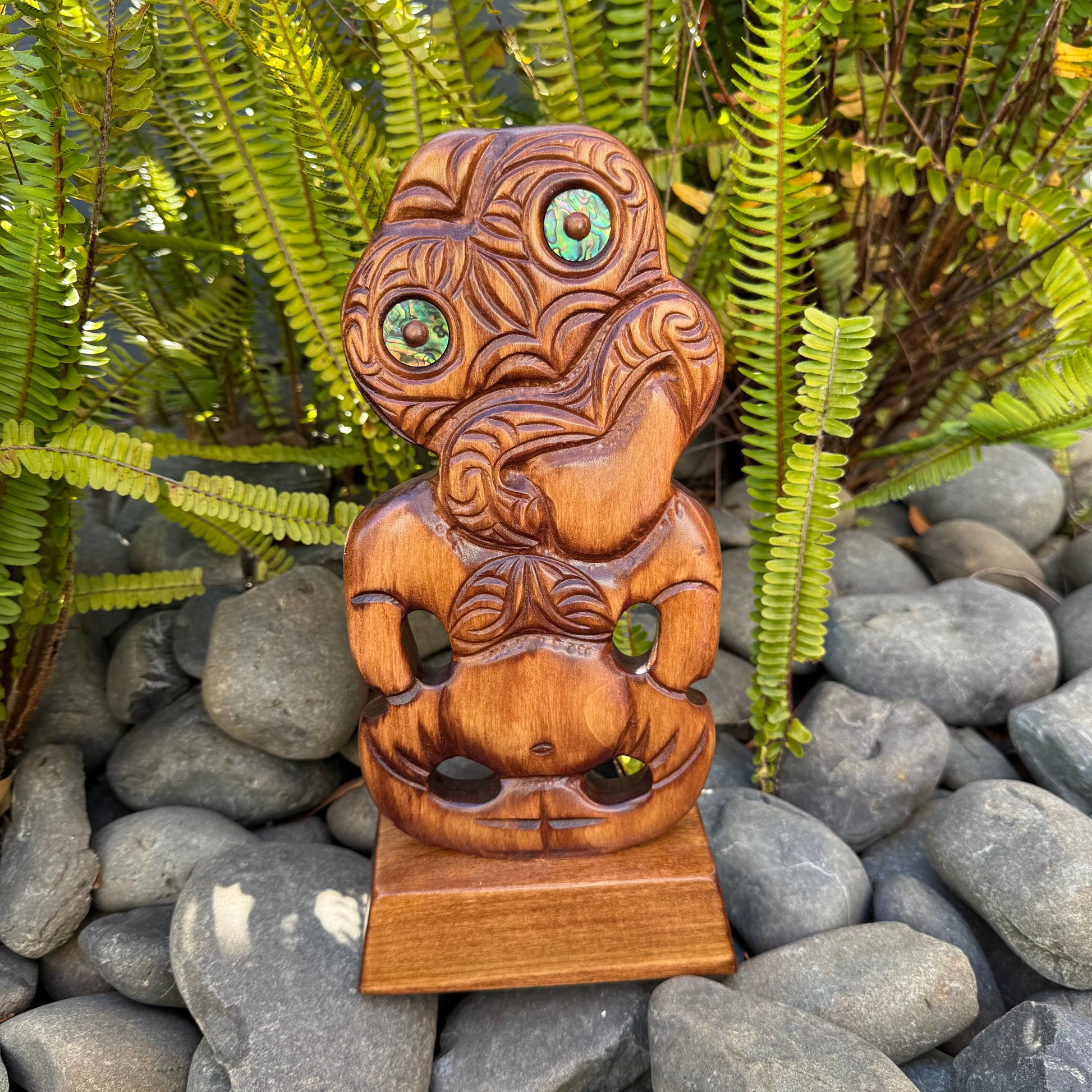 Tiki is a generic word used by Maori and other Polynesian cultures for human images, large or small, whether carved in wood, stone, bone or some other material. Tiki stands for fertility, the frequently occurring hands placed on the loins are a direct reference to fertility. Tiki is a good luck charm meant to keep evil spirits away.