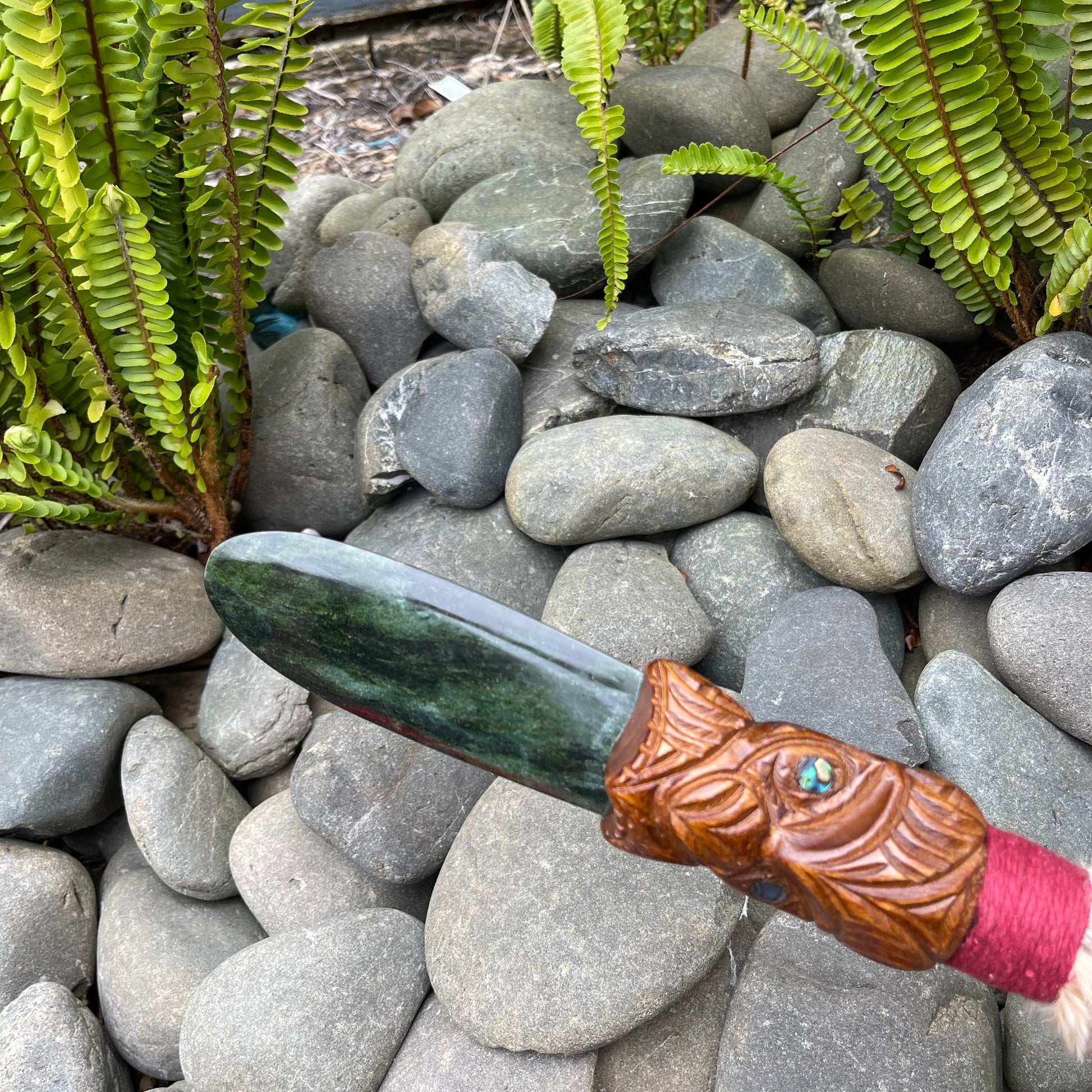 The Arero tongue has been fully carved on both sides with pāua eyes in the Upoko (head) where the base from which the tongue protrudes. The Ate (liver) is the flattened wooden end which was used for striking and has been carved as well. Has Pāua 21 on the blade.